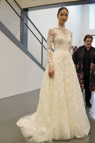 Handcrafted from a variety of fabrics, including double-face dutchess, jacquard, and crepe satin, these wedding dresses were designed for a bride who wants her dress to reflect her personal style and values. The collection also featured laced mesh gloves that add an element of sophistication and elegance to any ensemble; A-line dresses with floral embroidery paired with matching cathedral veils; cocoon-like capes with trains; empire waist dresses with three-dimensional lace floral ruffle bodices and tulle skirts; transformational dress included a detachable peplum ruffle; bridesmaid dresses and evening gowns featured simplistic satin, muted colors, off the shoulder necklines which sculptural yet organic silhouettes; iconic necklines; stretch crepe materials mold to the body for a smooth and comfortable fit.